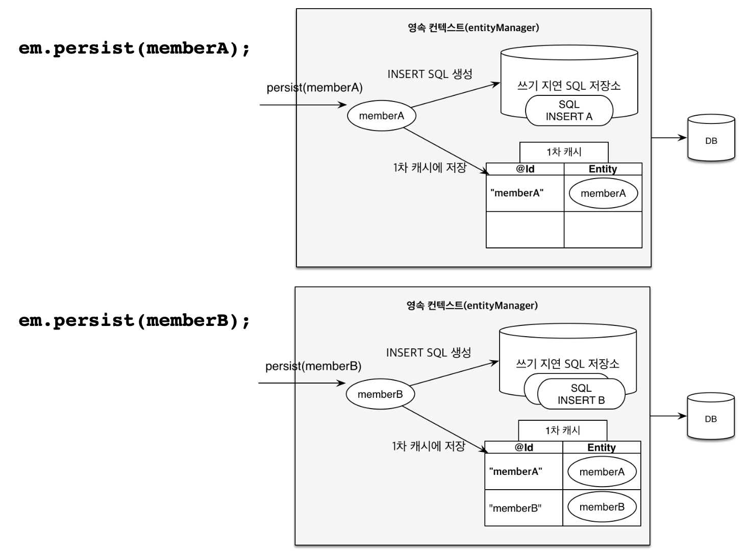 이 부분은 이해를 확실히 하기 위해 자료를 첨부하여 설명을 덧붙이겠다. persist를 하면 1차 캐시에 저장이 되고 쓰기 지연 SQL 저장소에 쿼리문이 생성되어 저장된다. 이후 트랜잭션을 커밋하면 쓰기 지연 SQL 저장소에 있던 쿼리문들이 한꺼번에(여기서는 두 개의 insert문) 순차적으로 flush, commit 된다.