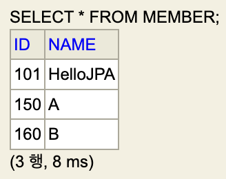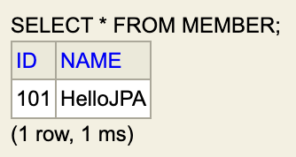 - 바로 위에서 작성한 코드로 인해 Id가 101이고 name이 HelloJPA인 member가 들어가 있는 상태이다.