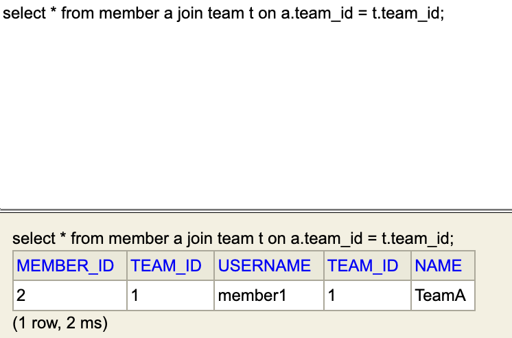 - 이후 H2 콘솔을 열고 join을 하면 다음과 같은 결과가 나온다.