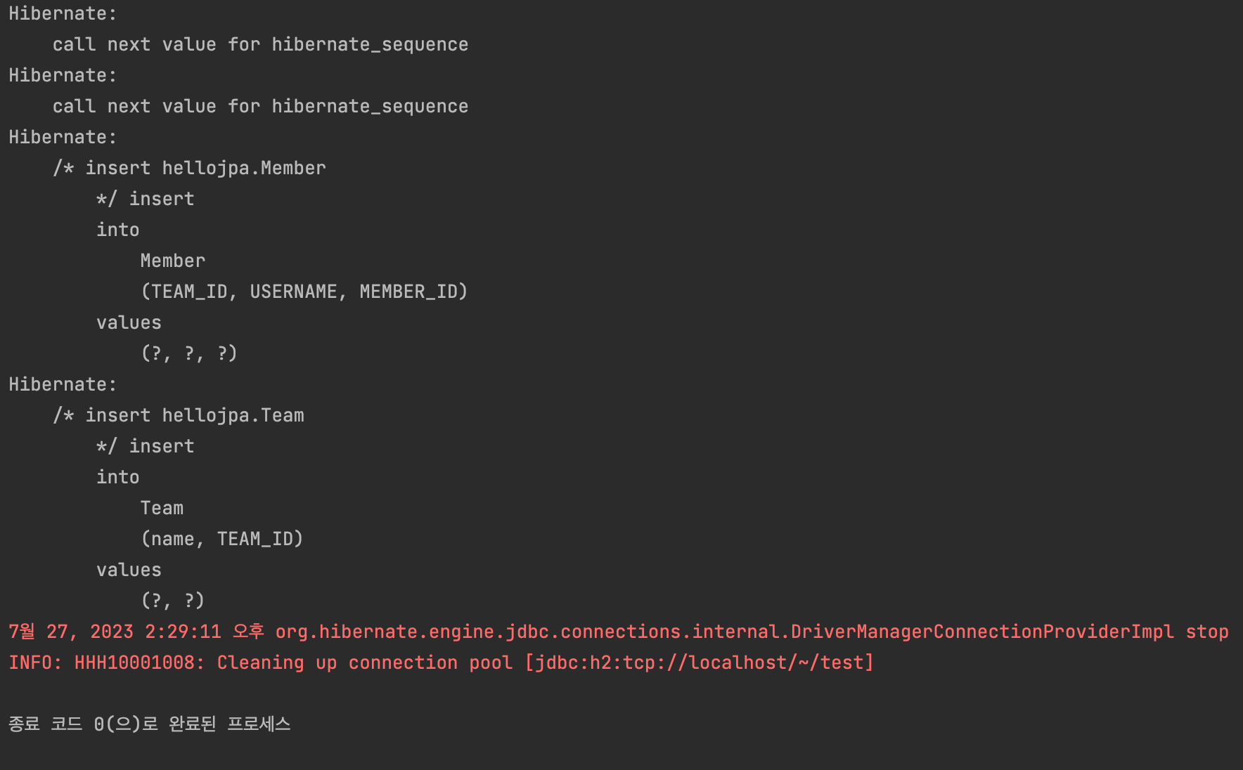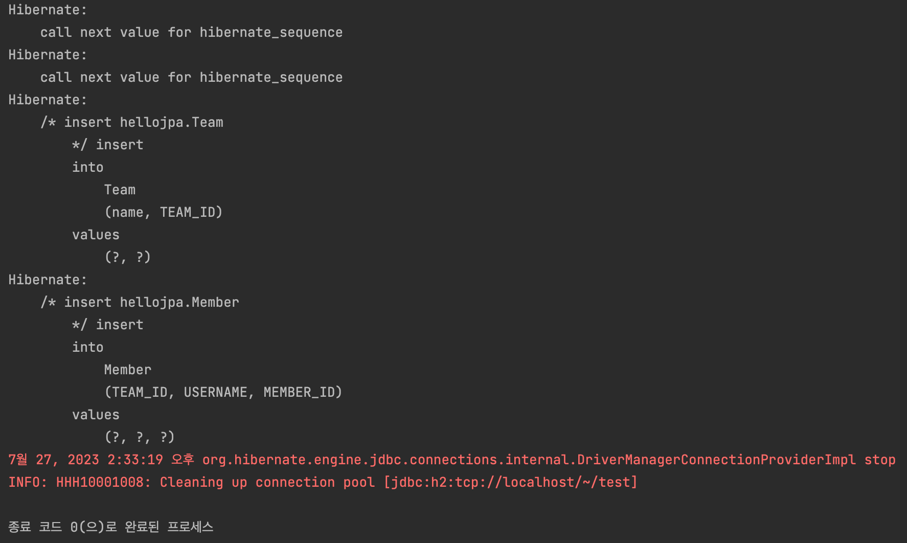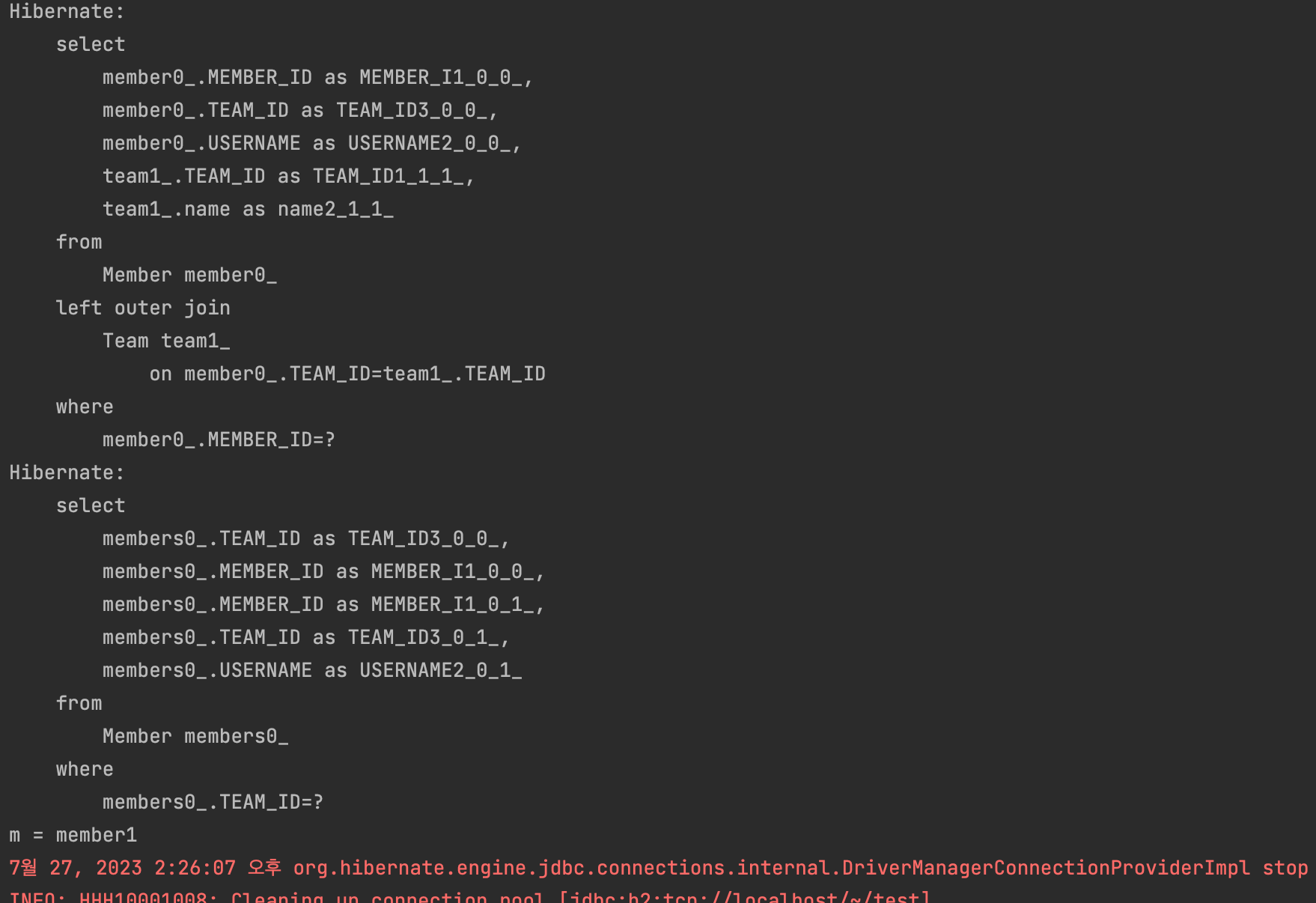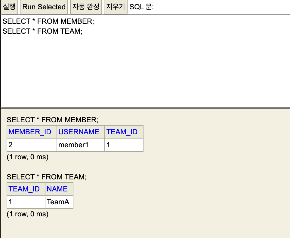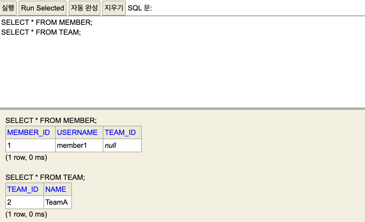 실행 결과를 보자. insert 쿼리문은 분명 두 번 나가는데, DB를 확인해보면 MEMBER 테이블의 TEAM_ID에 null 들어가있는 것을 볼 수 있다.